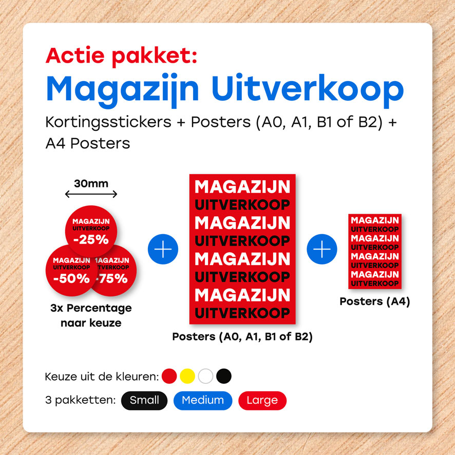 Magazijn Uitverkoop actie pakket met posters (A1, A2, B1 of B2 + A4), en kortingsstickers (3x percentage naar keuze, 30mm) in de kleuren rood, geel, wit of zwart. Ideaal om snel een actie mee op te zetten. Maak keuze uit je gewenste pakket (Small, Medium of Large), kleur, belijming stickers en percentages.