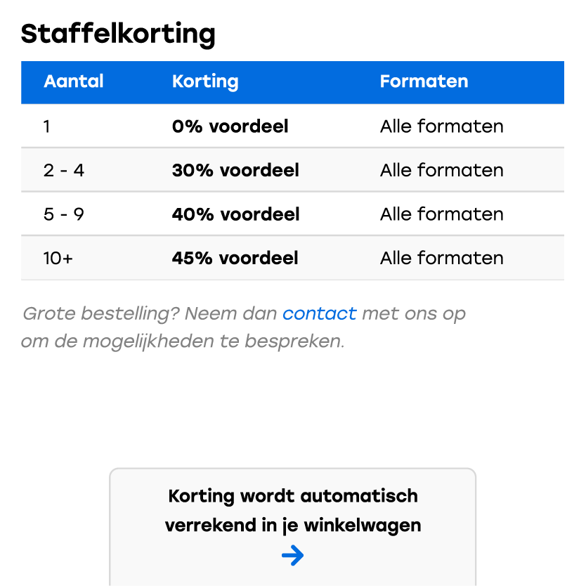 | 5 – 9 | 40% voordeel | Alle formaten |