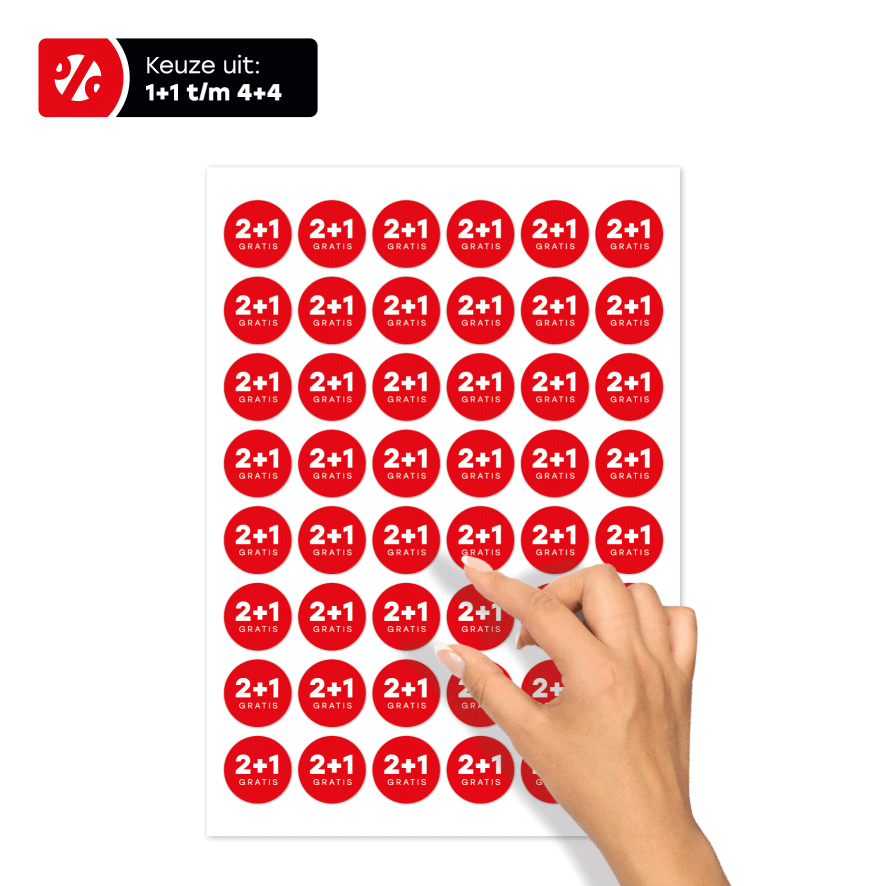 Plus stickers van 30mm in de kleur rood. Ideaal om je eigen combi deals mee te maken. De stickers zijn permanent of afneembaar. Wil je de sticker gebruiken voor textiel? De afneembare stickers zijn goed te gebruiken als textielsticker. De plus stickers worden geleverd op A4 vellen en zijn makkelijk op te bergen. Je kunt kiezen uit de combinaties 1+1 gratis t/m 4+4 gratis. Maak keuze uit je gewenste plus combinatie, belijming en aantal. Profiteer van onze staffelkorting bij hogere aantallen.