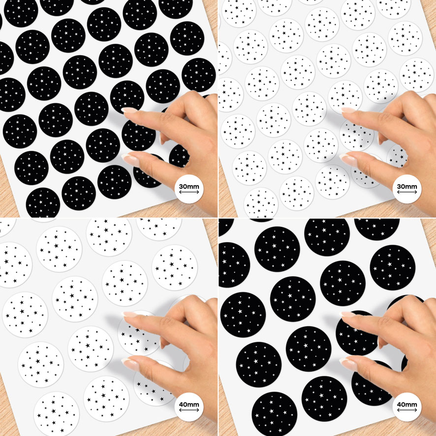Stickers met sterretjes van 30 / 40mm in de kleuren zwart en wit. Gebruik deze sticker als sluitsticker, op inpak papier of als onderdeel van je webshop verpakking. De stickers worden geleverd op A4 vellen en zijn makkelijk op te bergen. Maak keuze uit je gewenste kleur, formaat en aantal. Profiteer van onze staffelkorting bij hogere aantallen.